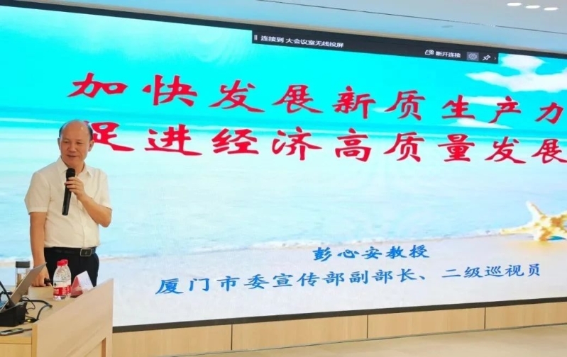 面对鲜红的党旗,全体党员庄严宣誓,“我志愿加入中国共产党,拥护党的纲领,遵守党的章程,履行党员义务…”铮铮誓言铿锵有力,庄严承诺掷地有声,是初心使命的宣示,是理想信念的笃定,更是接续奋斗的昭示。 厦门市委宣传部副部长、二级巡视员彭心安教授围绕《加快发展新质生产力,促进经济高质量发展》为党员讲授党课。彭教授以“认真梳理习近平总书记关于新质生产力的重要论述”“加快发展新质生产力,促进科技创新和产业创新融合,推进新型工业化”“坚定不移深化改革,增强发展内生动力,为发展新质生产力创造条件”几个切入点分析了国内外宏观经济形势,结合案例深入浅出地阐述发展新质生产力的核心要义和实践要求,引导党员干部要锚定发展新质生产力的新使命新要求,忠诚履职、担当尽责,铆足干劲、奋勇争先,努力展现新担当新作为。(厦门外理)