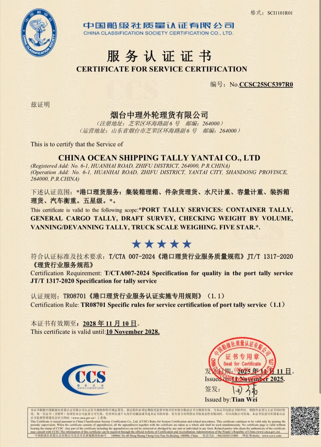 烟台外理顺利通过中国船级社港口理货服务“五星级”认证